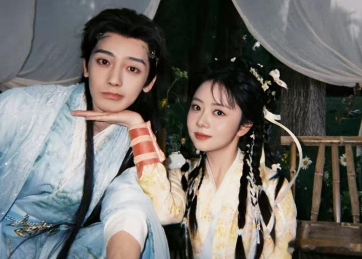 谭松韵头顶发包的彩带颜色,搭配黄色碎花古装服饰。
