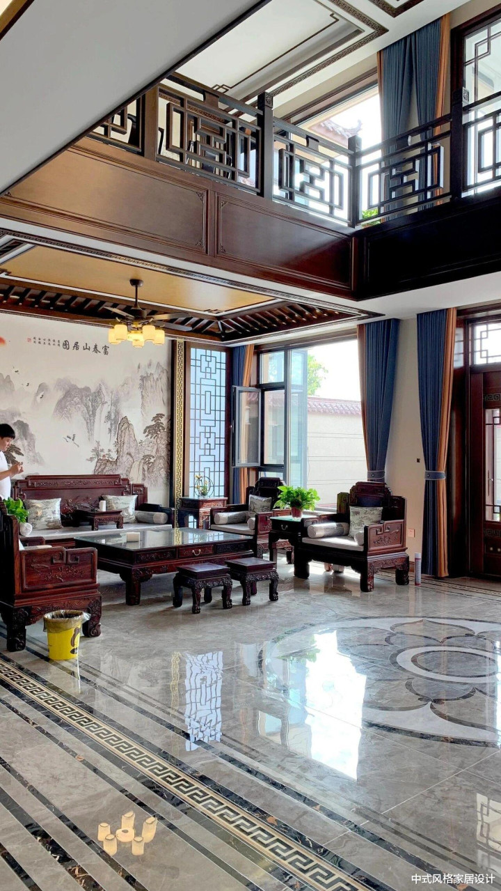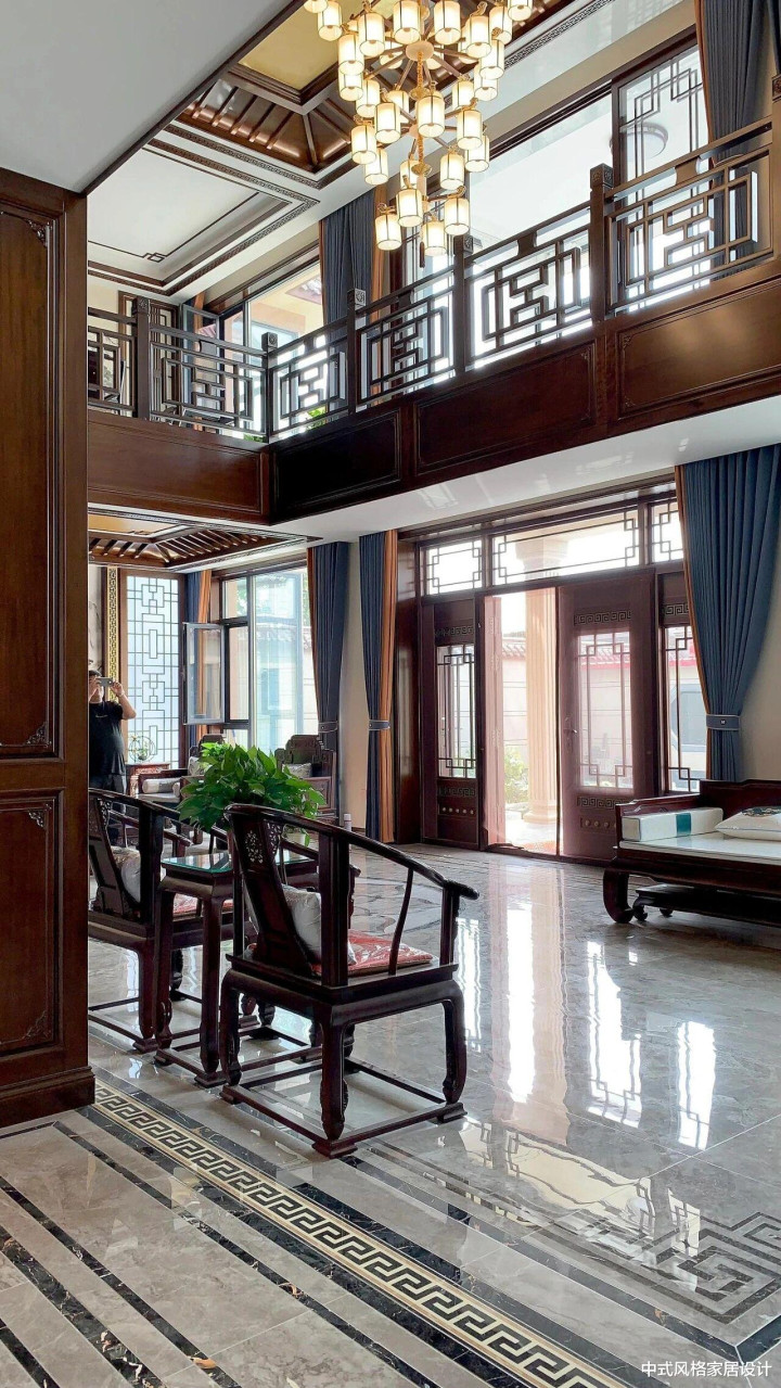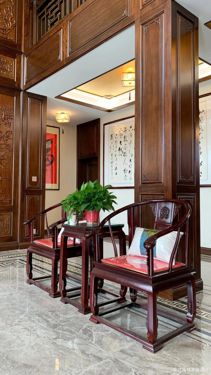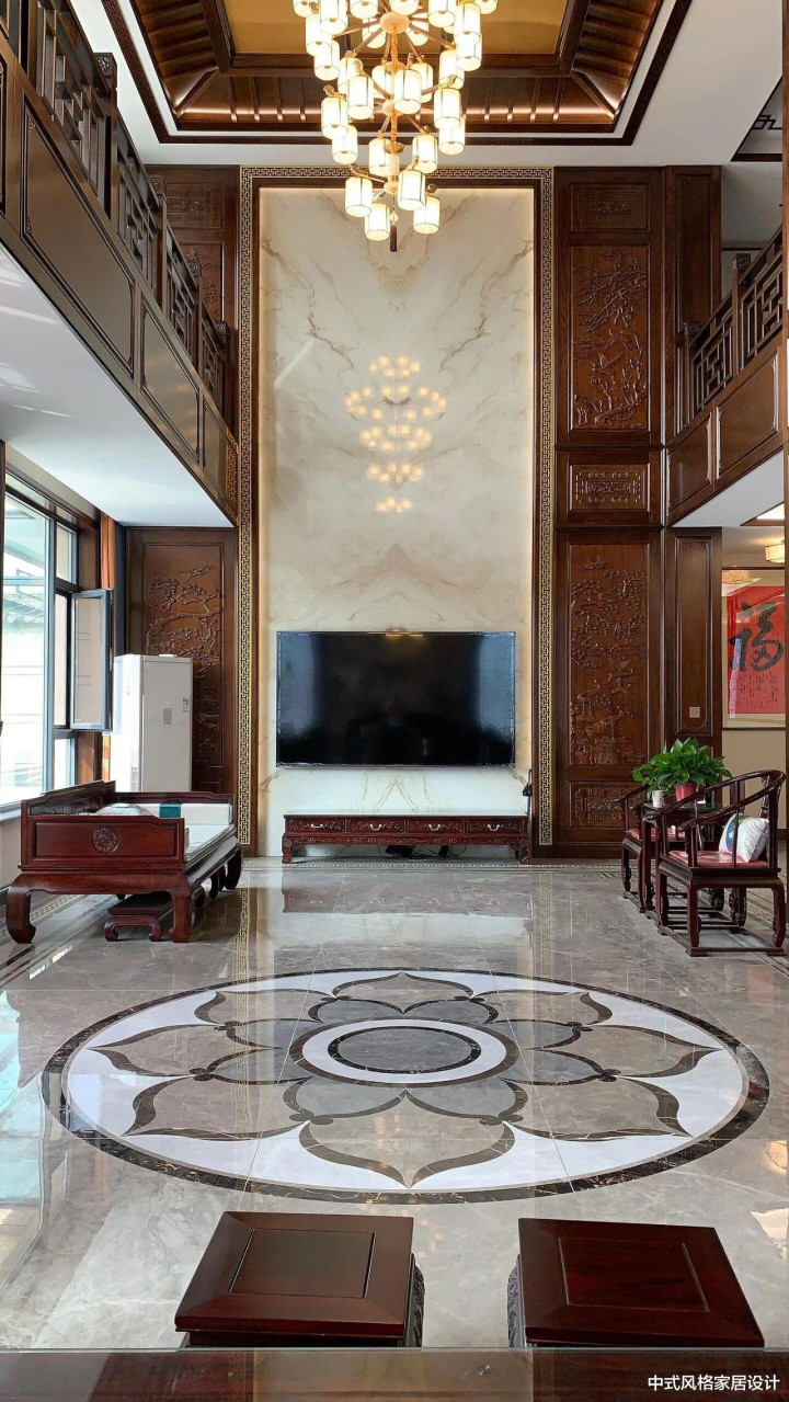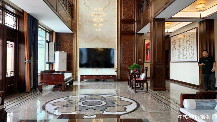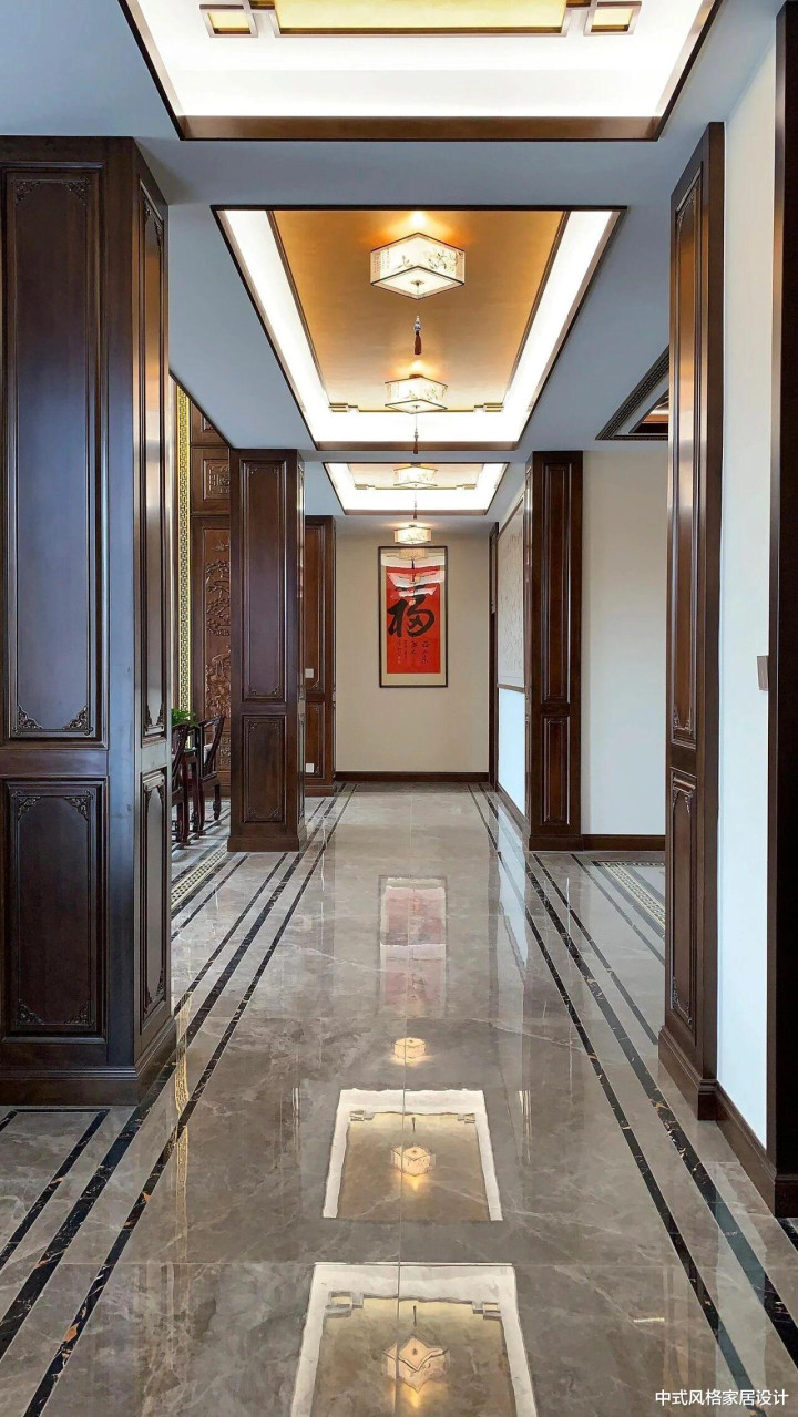 “业主不愿空间过于暗沉”,这句简单的要求成为设计的重要起点。传统中式风格常以深色木作、厚重家具为特色,容易造成空间压抑。为此,我们选择了亮面瓷砖作为解决方案——它们既能反射光线,提升空间明亮度,又在材质上与中式元素的温润形成巧妙对比。