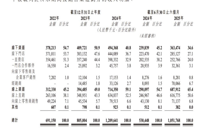 招股书显示,2022年到2025上半年,林清轩营收分别为6.91亿元、8.05亿元、12.1亿元、10.52亿元,线上营收分别为3.12亿、3.94亿、7.14亿、6.88亿元,2022-2024年复合增长率达到51.2%,增速高于线下。2022-2025上半年,线上营收占比由45.2%、49%、59.1%逐渐提升至65.4%。