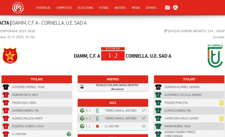 中国足球太久没有出现过这样的现象级小将了。最新消息,随着西班牙加泰罗尼亚U14荣誉联赛第9轮结束,达姆1比2惜败科尔内利亚,来自中国的明星球员李昊炎再次破门,他的头球帮助球队一度将比分迫近,但最终还是输球,不过,他已经成为队中的头号射手!
